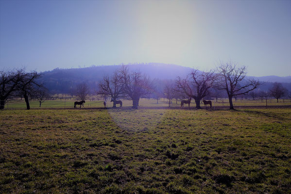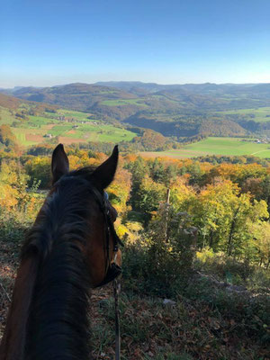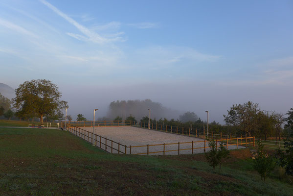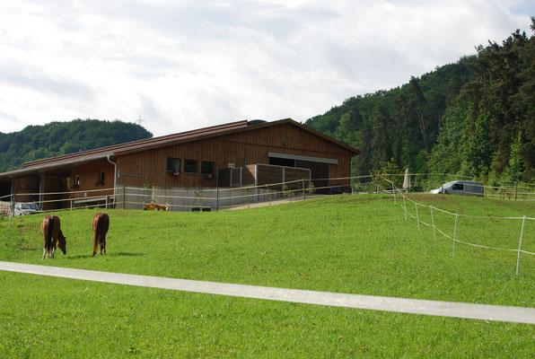 Um die Pferde zu trainieren, steht ein Aussenplatz zur Verfügung. Er misst 20x40m und hat Nachtbeleuchtung. Das nahe Ausreitgebiet am Blauen ist sehr weitläufig und bietet viele tolle Möglichkeiten für lange Ausritte am Berg.