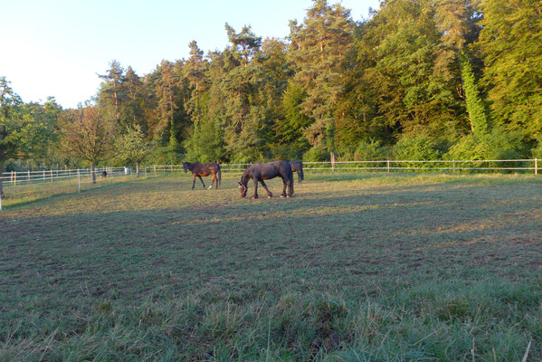 Alle Pferde können täglich auf den weitläufigen, gut gepflegten Weiden grasen und sich austoben und werden von fachkundigem Personal betreut. Die grossen Weiden verlocken die Pferde zum Rumrennen und ausgiebigen Wälzen, nicht immer zur Freude der Besitzer - aber sehr wohl zur grossen Freude der Pferde! Es besteht die Möglichkeit, die Pferde entweder auf Einzelweiden oder auf Wunsch auch in Gruppen weiden zu lassen. Die Pferde sind - sofern es die Witterung zulässt - täglich mehrere Stunden im Freien.